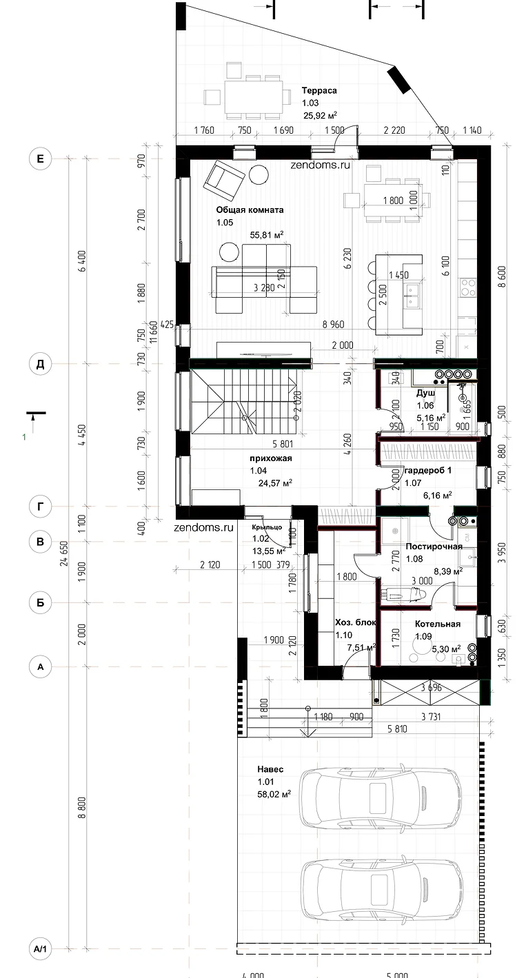 прихожую зону с бытовыми помещениями, холл с лестницей на второй этаж,