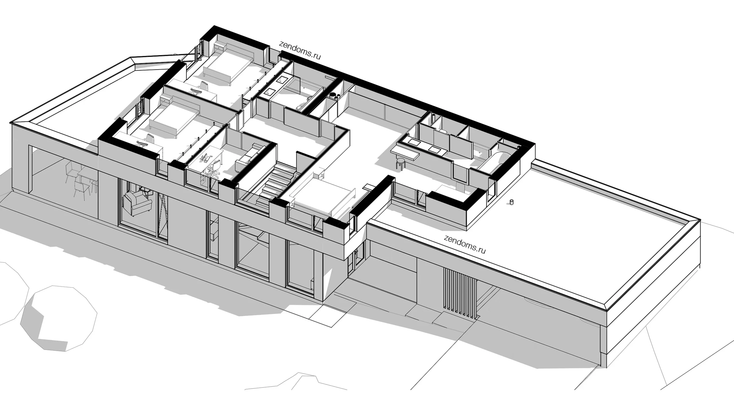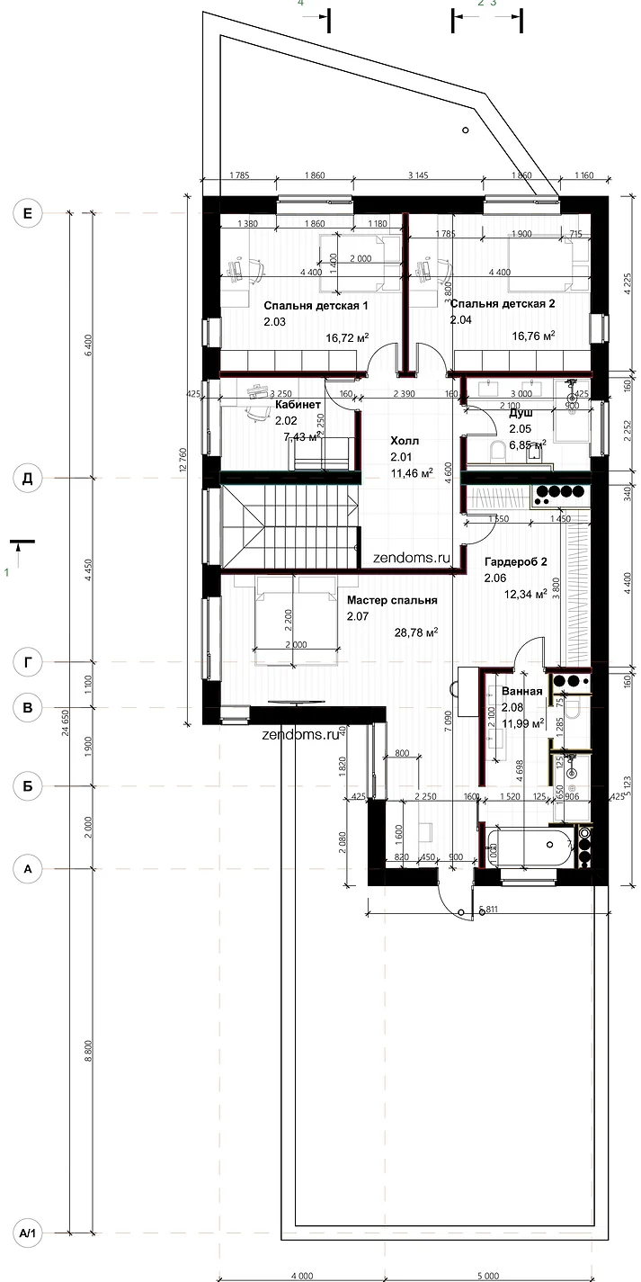 Второй этаж включает в себя две детские комнаты и главную спальню с просторной гардеробной и собственным санузлом, а также общий санузел и кабинет.