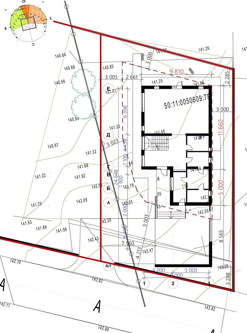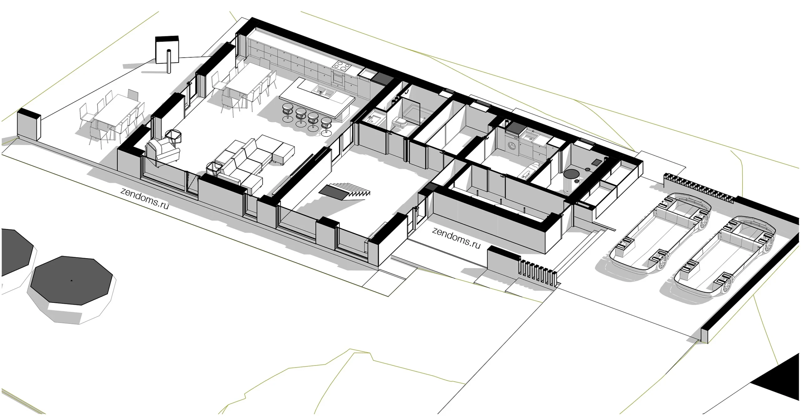 Участок в виде параллелограмма. Дом занимает примерно половину площади участка.