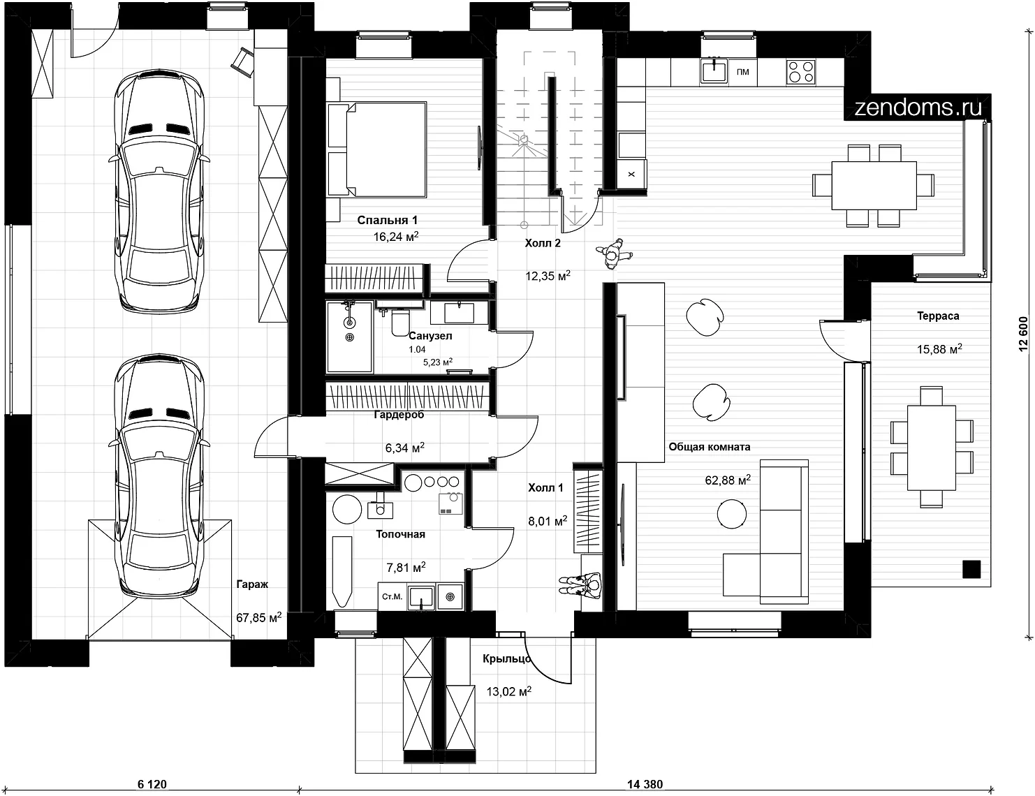 Помещения выстроились вдоль центрального холла. В зоне прихожей разместились хозяйственные помещения. Вход из гаража в дом через гардеробную. Выход на террасу из гостиной.