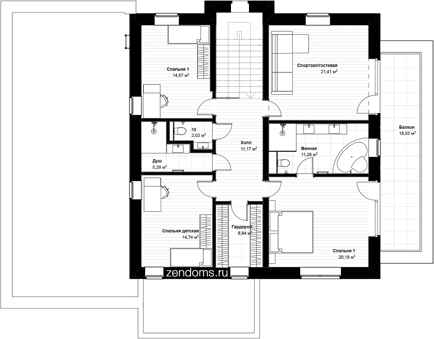 На втором этаже расположились три просторные спальни, два санузла, гардеробная,