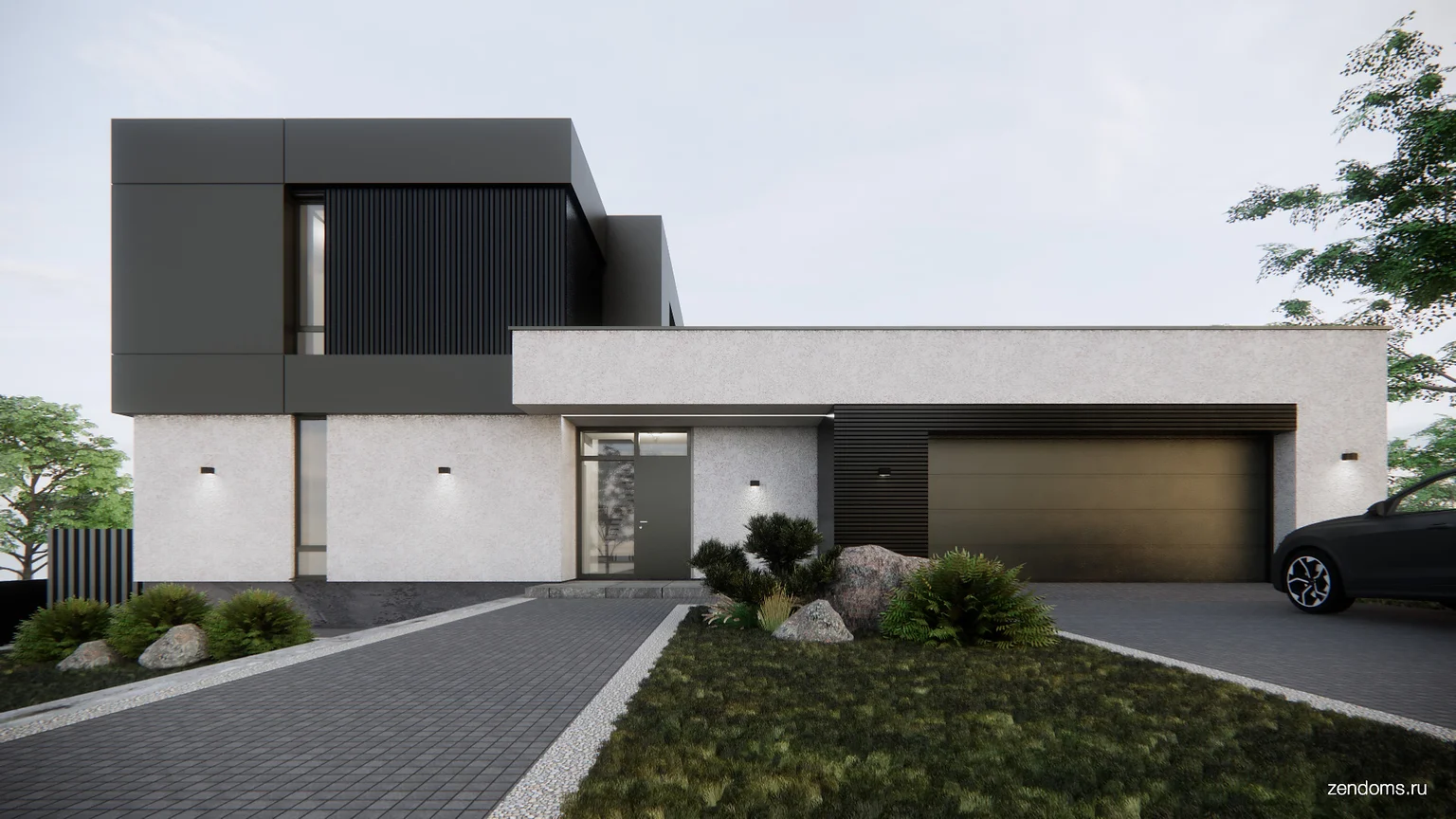 Перепад рельефа в 9 метров позволил заглубить цокольный этаж и сделать здесь отдельную зону SPA с хамамом, душевой, просторной комнатой отдыха, мини-кухней, раздевалкой, кладовкой и туалетом. Дополнительно предусмотрен хозяйственный блок для садовой техники с возможностью выхода на участок и уличный бассейн.