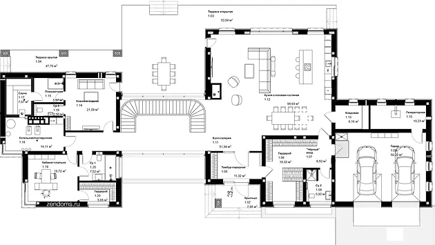 Слева: кабинет, котельная-постирочная, зона СПА. Справа: кухня-гостиная внушительный размеров 93 кв.м. призвана вмещать многочисленных друзей и гостей.