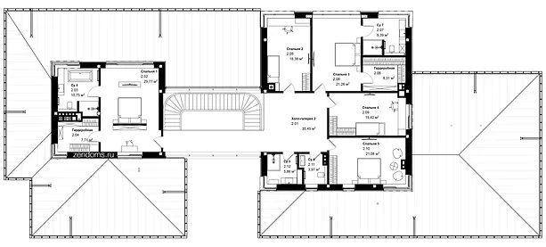 Блок мастер спальни со своей гардеробной и ванной находится в левой части дома. Детские спальни во главе со старшим поколением разместили в правом блоке.