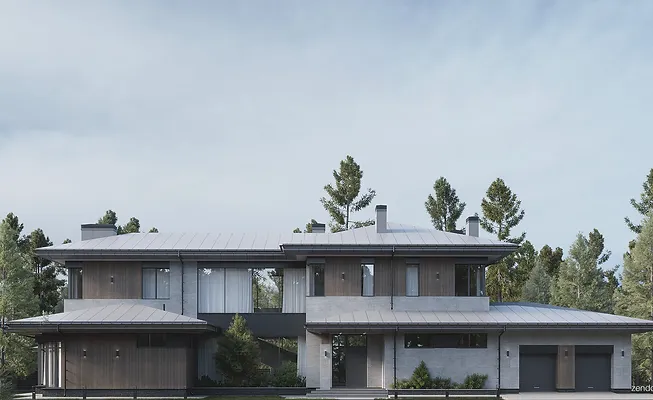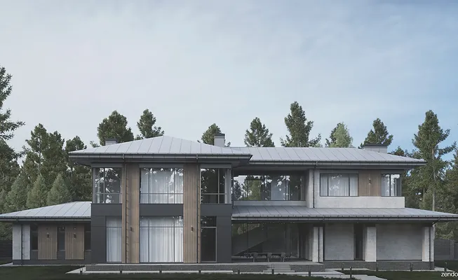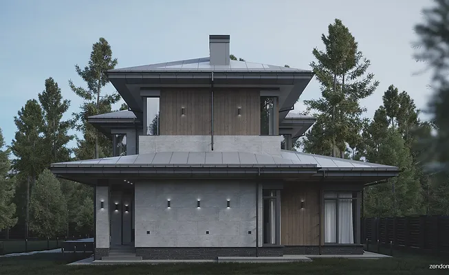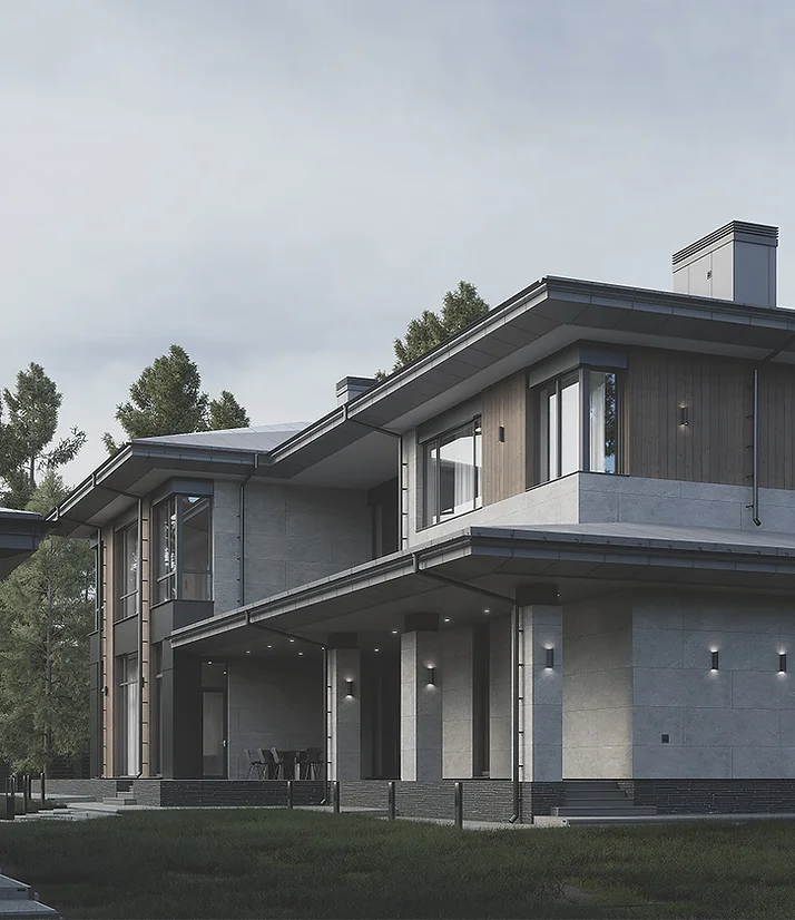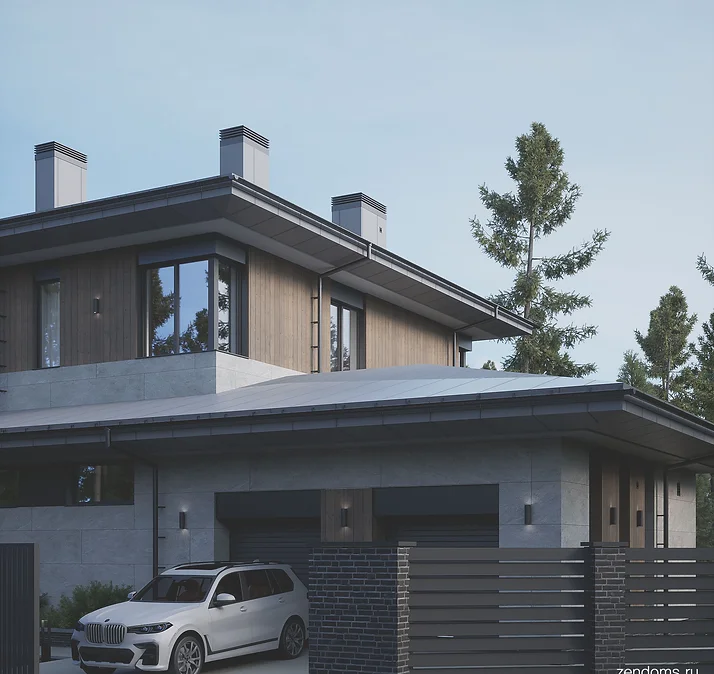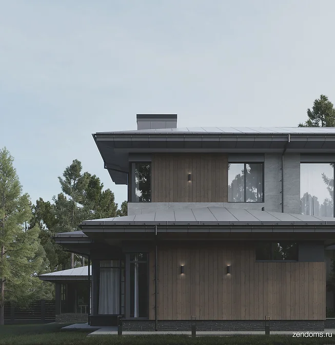 Дом сделан в комбинации стилей. На фасаде крупноформатный керамогранит, термообработанное дерево, штукатурка, алюмокомпозит. Кровля металлическая фальцевая.