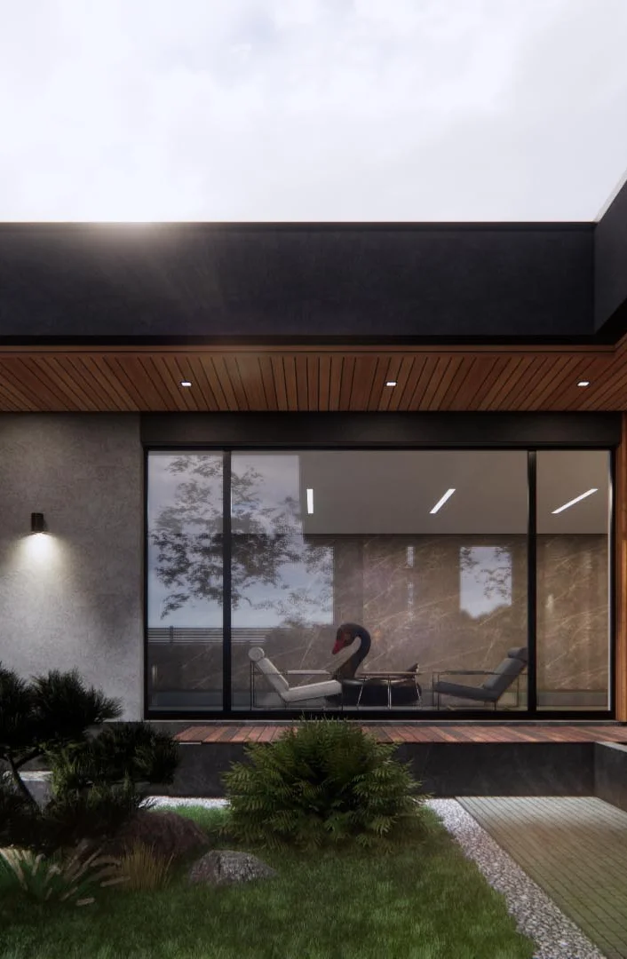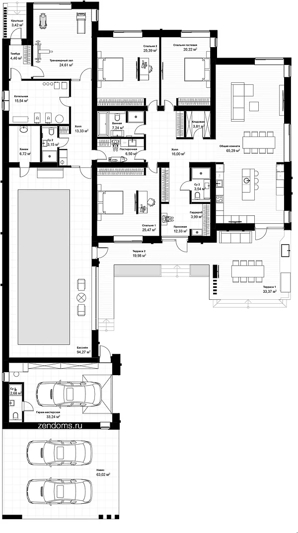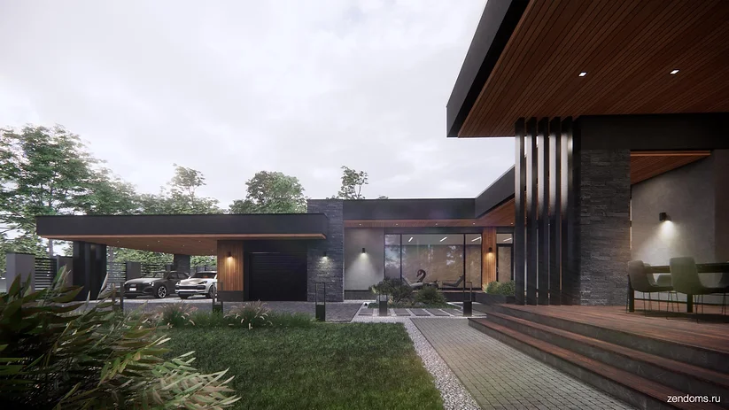 Под контуром навеса разместился единый переход между кухней, террасой, крыльцом, бассейном и вход в гараж-мастерскую.