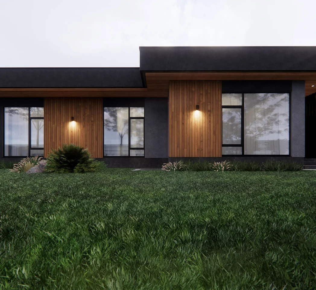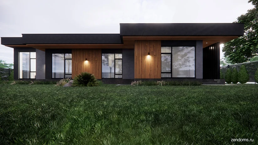 На фасаде решили применить сочетание из материалов средней ценовой категории: керамогранит, декоративная штукатурка, термообработанный планкен и искусственный камень под сланец.