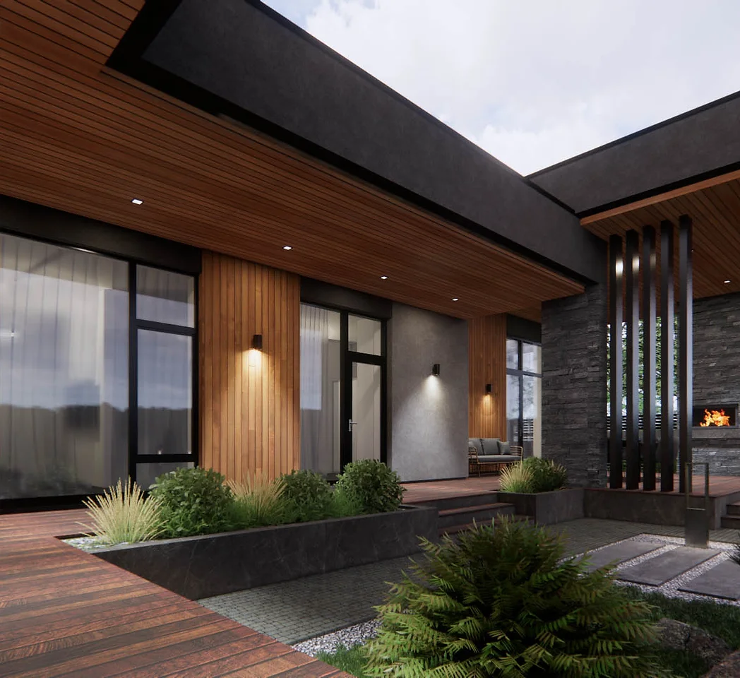Отделка: керамогранит, декоративная штукатурка, термодерево, искусственный камень